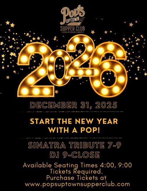 Tickets required. Space is limited. Only 2 Time Slots Remain for NYE at Pop’s Uptown Supper Club 4pm and 9pm!