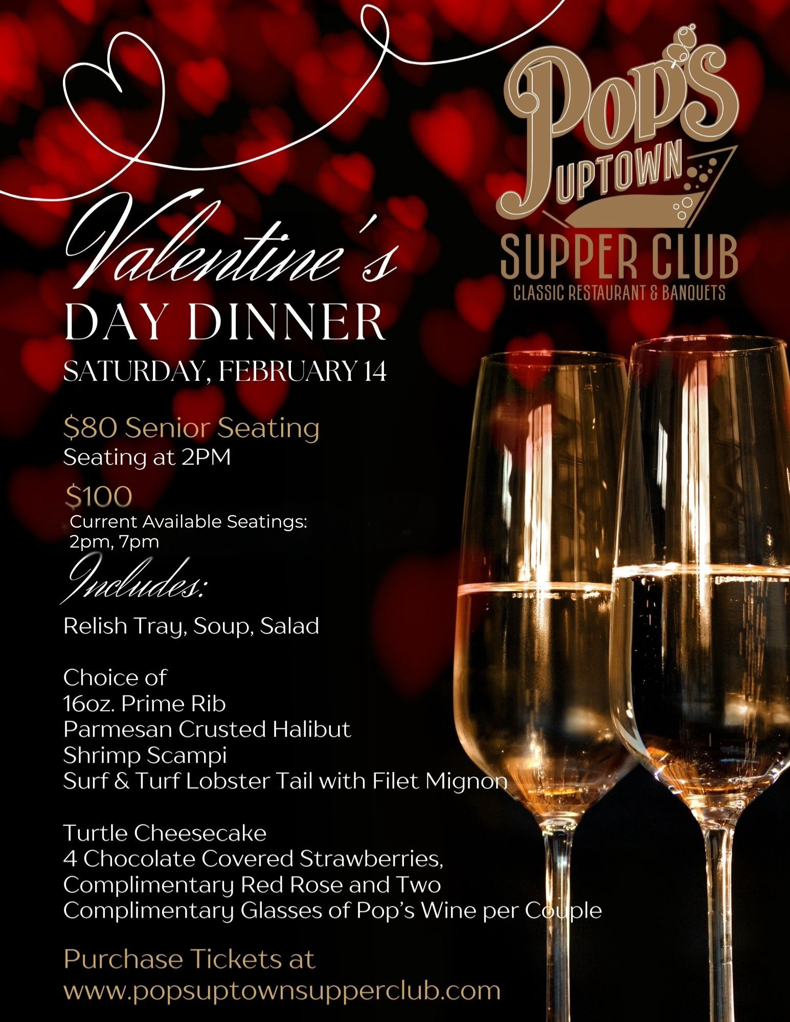 Each Couple Receives: 1 Turtle Cheesecake, 4 Chocolate Covered Strawberries, 2 Glasses of Pop’s Wine, and 1 Red Rose.